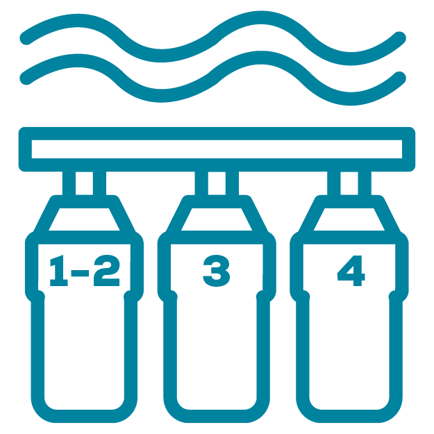 In stage 1, the water passes through a mechanical Pre-Filter that removes larger particles like sediment and rust. Next, the Carbon filter removes Chlorine and Chloramines.